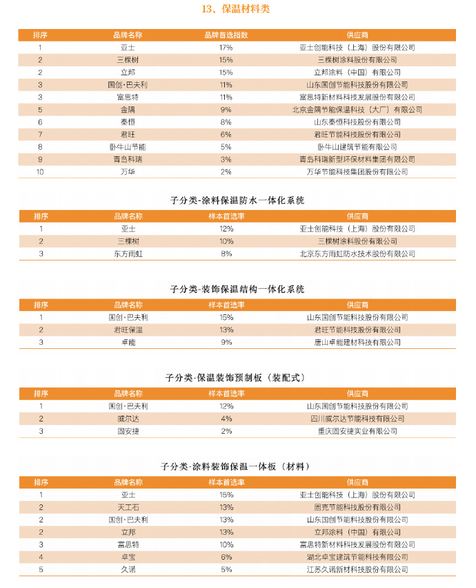《报告》结合科学、系统、全面的测评数据,揭晓了“2025房建供应链综合实力TOP500首选供应商服务商品牌”榜单。在保温材料方面,亚士、三棵树、立邦、国创-巴夫利、富思特、金隅、秦恒、君旺、卧牛山节能、青岛科瑞、万华依次位列“保温材料类TOP10”。其中,三棵树、立邦并列第二,国创-巴夫利、富思特并列第三。
