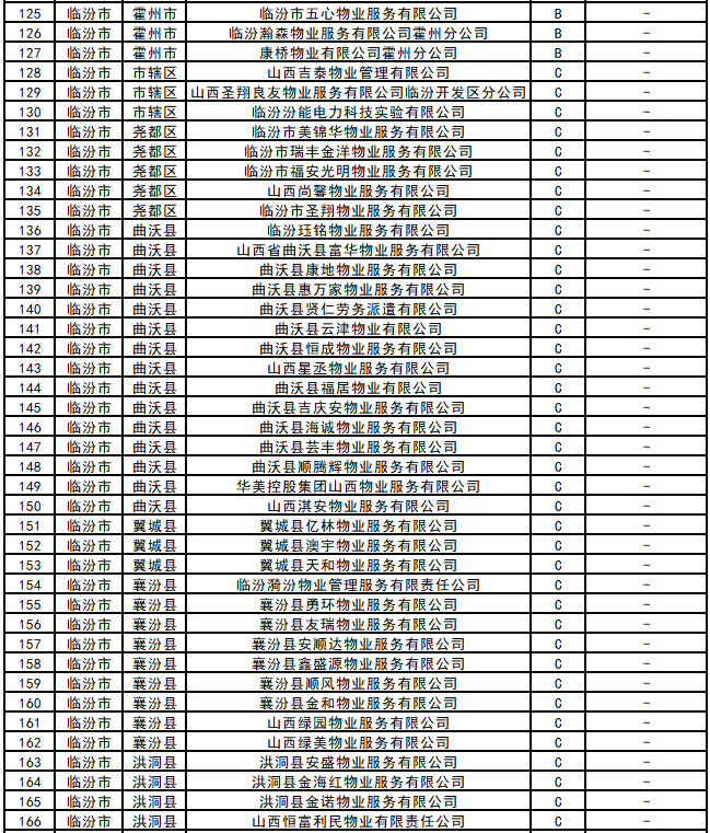近日,山西省住建厅公布了2023年度房地产企业信用评价结果。该信用评价通过对我省房地产开发企业、房地产经纪机构、房地产估价机构及物业服务企业信用评价申报材料进行初评,将房地产企业信用等级从高到低评定为 A、B、C和D四个等级。我市参加信用评价房地产企业共计525 家,其中房地产开发企业196家,房地产经纪机构95家,房地产估价机构10家,物业服务企业224家。未参评企业共计 334 家。评级结果如下表所示: