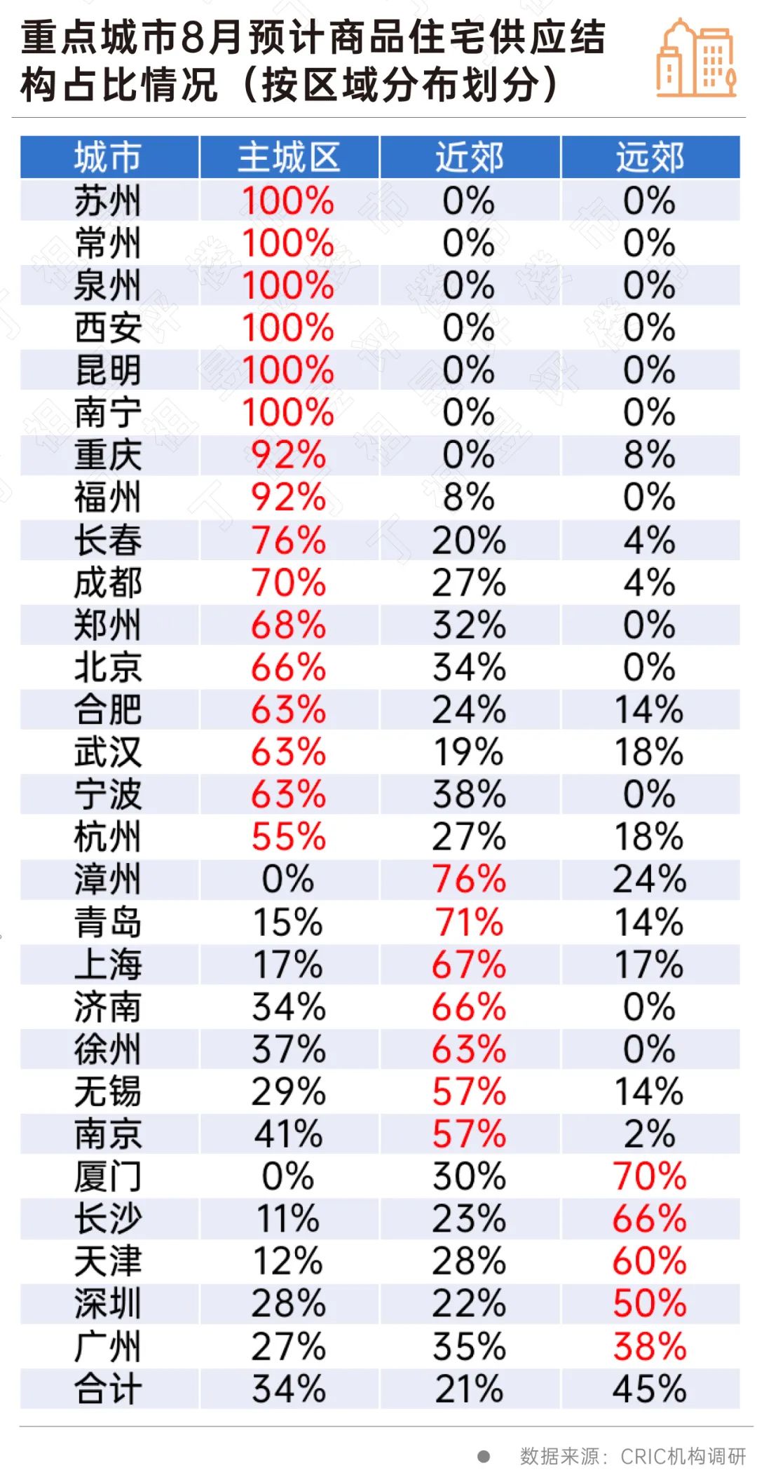 从供应结构各项目区域分布来看,重点城市主城、近郊、远郊占比结构为34%、21%和45%,供应重心逐步由主城区向远郊转移。