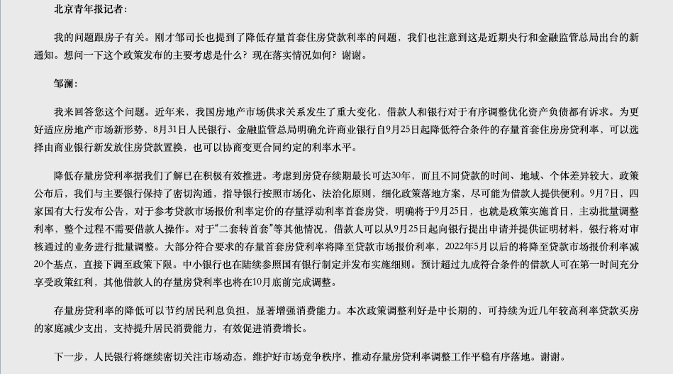 2023年9月20日,央行发布“国新办举行经济形势和政策国务院政策例行吹风会文字实录”,会上就降低存量首套住房贷款利率落地问题展开了具体论述。