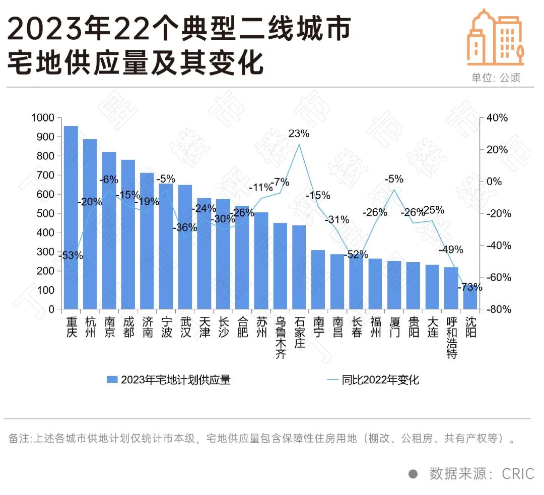 从2023年供地计划来看,CRIC整理的900余个样本城市数据显示:近七成规模以上县市供地指标同比下滑,住宅土地供应总量较2022年下降了13%。其中二线城市下调幅度最大,同比2022年降幅高达27%。