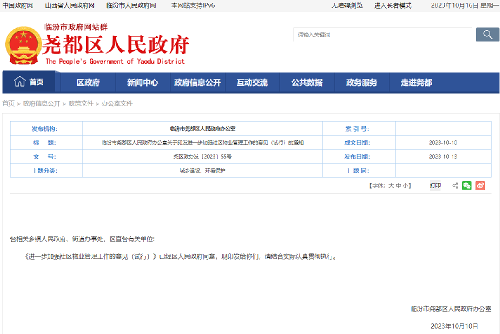 临汾市尧都区人民政府办公室关于印发进一步加强社区物业管理工作的意见(试行)的通知