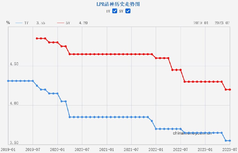 7月20日,中国人民银行授权全国银行间同业拆借中心公布,2023年7月20日贷款市场报价利率(LPR)为:1年期LPR为3.55%,5年期以上LPR为4.2%,均与上月持平。