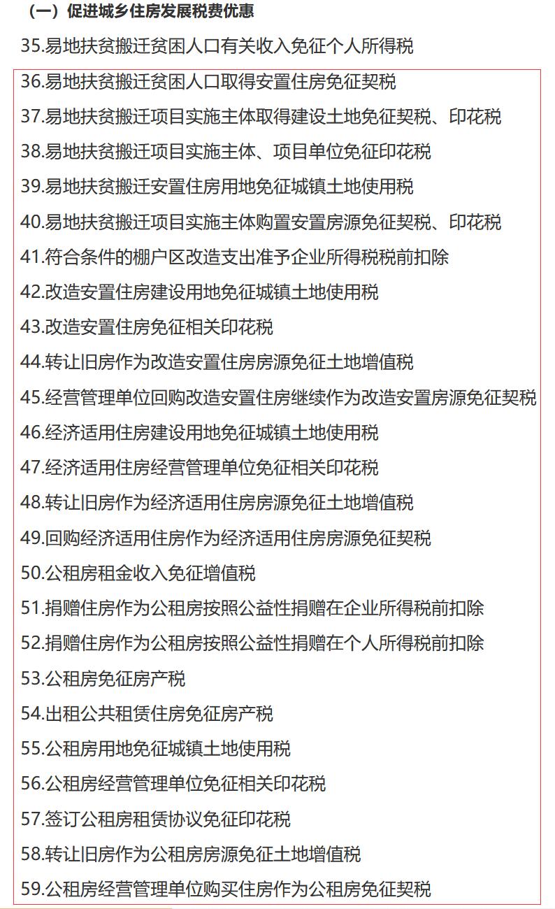在“促进城乡住房发展”方面,有关扶贫搬迁安置、改造安置住房、经济适用住房建设和公共租赁住房建设等方面的税费优惠多达24项。