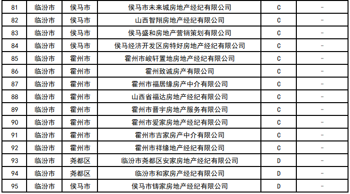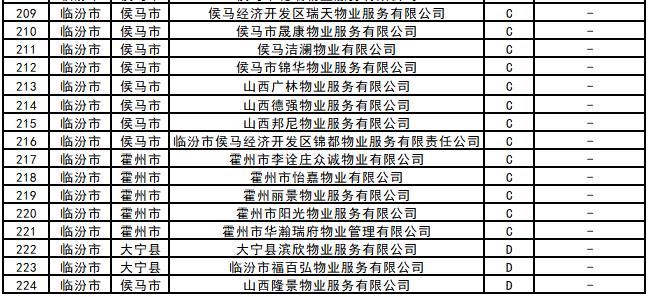 近日,山西省住建厅公布了2023年度房地产企业信用评价结果。该信用评价通过对我省房地产开发企业、房地产经纪机构、房地产估价机构及物业服务企业信用评价申报材料进行初评,将房地产企业信用等级从高到低评定为 A、B、C和D四个等级。我市参加信用评价房地产企业共计525 家,其中房地产开发企业196家,房地产经纪机构95家,房地产估价机构10家,物业服务企业224家。未参评企业共计 334 家。评级结果如下表所示: